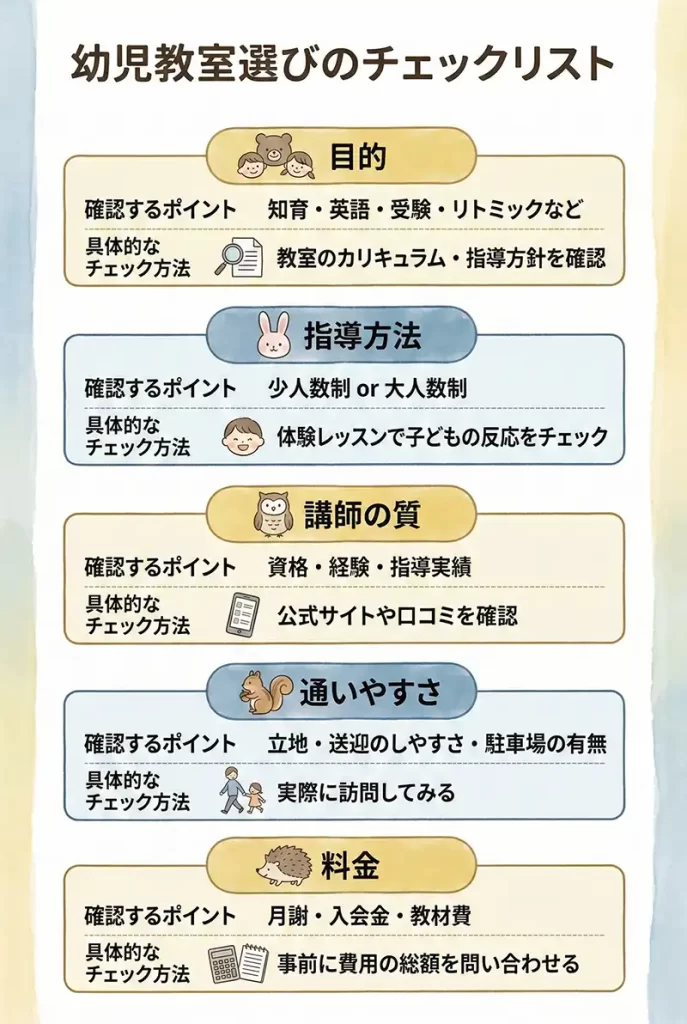 ①目的(知育・英語・受験対策) ②指導方法(少人数・個別・集団) ③講師の質 ④通いやすさ(立地・時間) ⑤料金 の5つをチェックしましょう。